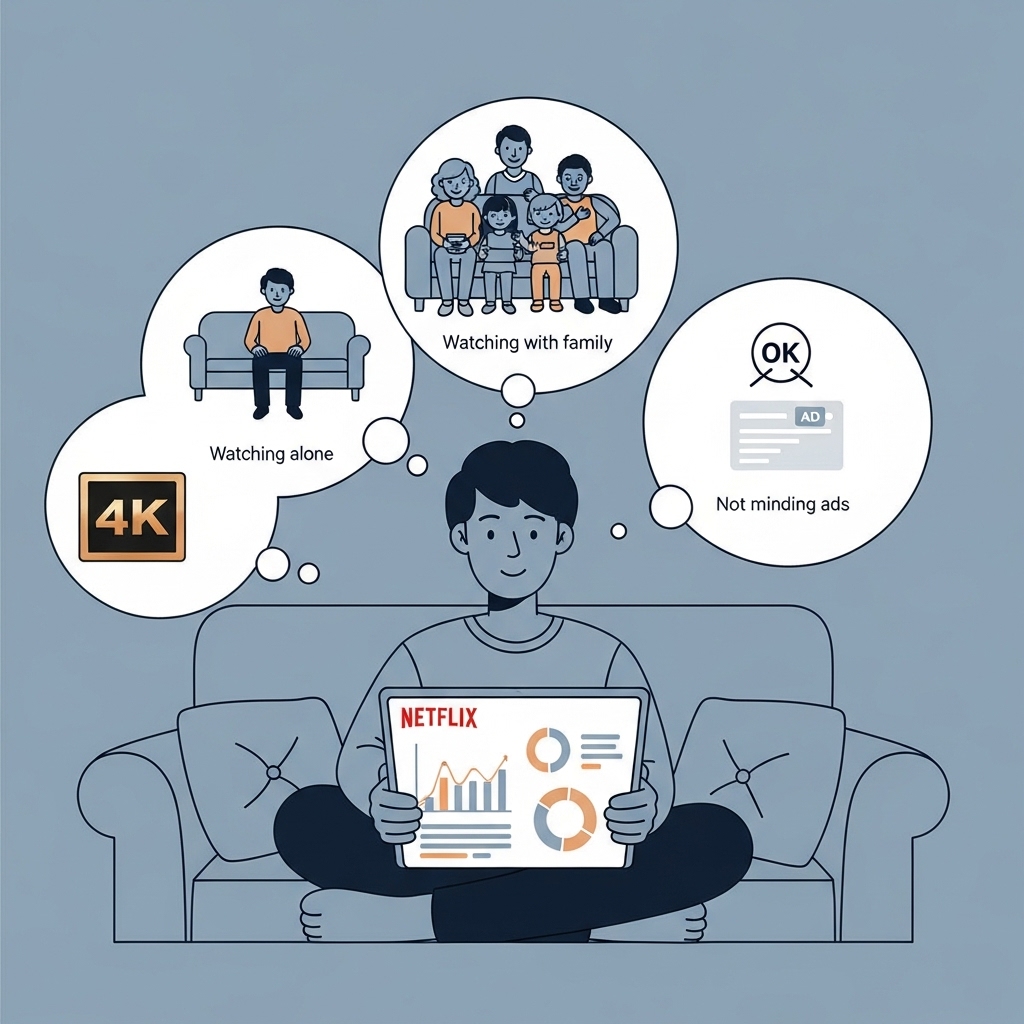 - ✅ 시청 습관(인원, 화질 선호) 분석 후 최적의 요금제 선택. 혼자 본다면 베이식 또는 광고형, 여럿이 본다면 스탠다드나 프리미엄이 유리해요.