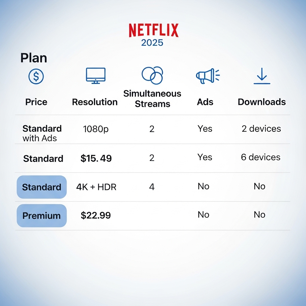 - ✅ 2025년 넷플릭스 요금제는 광고형, 베이식, 스탠다드, 프리미엄으로 구성. 각 요금제별 특징(화질, 동시접속, 광고)을 정확히 파악하는 것이 중요해요.