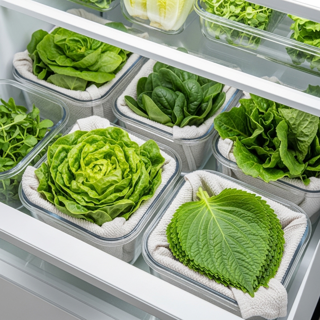 - 물기를 제거 후 키친타월에 싸서 보관: 키친타월이 습도를 조절해 줍니다. 밀폐 용기나 지퍼백에 넣어 냉장고 채소 칸에 보관합니다.